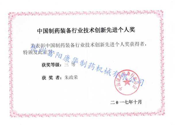 祝賀朱政榮董事長(zhǎng)中國(guó)制藥裝備行業(yè)技術(shù)創(chuàng)新先進(jìn)個(gè)人三等獎(jiǎng)!